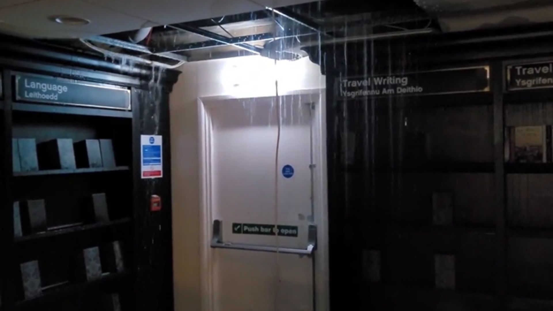 The Swansea branch’s staff shared a video of rain pouring through the ceiling, empty shelves and dozens of wet books on the floor, clocking up more than 31,500 views.